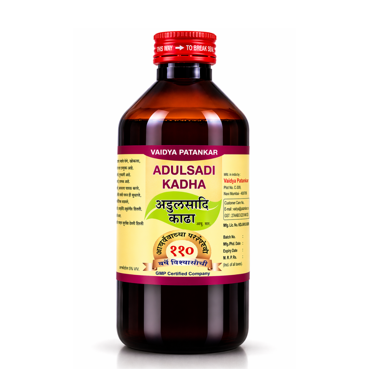 Ingredients: Adulsa, Gulab Kali, Harda, Behada, Awala, Gulvel, Miri, Sunth, Jesthimadh.